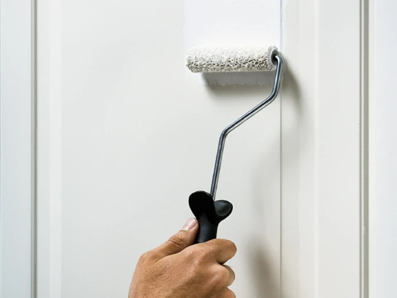 - Nu er du klar til at svinge malerrullen. Husk at omrøre malingen inden anvendelse. Påfør malingen i jævne strøg med en 15 cm lang malerrulle, hvor du hele tiden sørger for rigeligt med maling. Du bør altid male vådt-i-vådt for jævnt udtryk, som også mindsker uhensigtsmæssige streger. Dvs. at du skal sørge for ikke at male ovenpå tørret malet, men udelukkende ovenpå nyligt malet. Døren skal have 2 lag. Husk at vente mindst 4 timer mellem lagene. Efter 6 timer efter andet lag, så kan du tage dørene i brug. Vær opmærksom på at gennemhærdningstiden kan tage op til 28 dage, som betyder du bør være varsom indtil da.