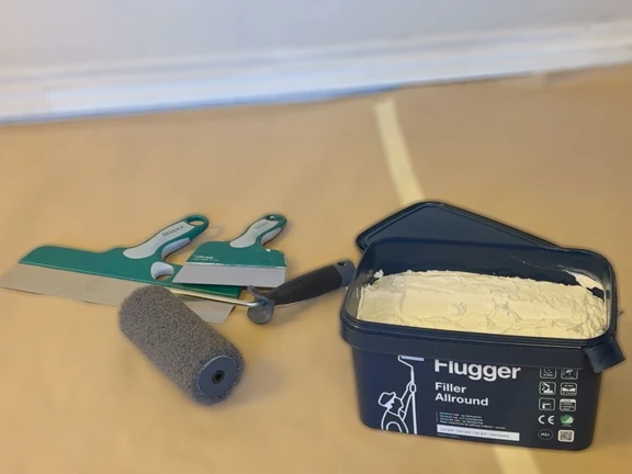 Filler Allround egner sig perfekt til at rulle på og derefter glatte væggen ud med en bredspartel, se guiden herunder. På den måde kommer du hurtigt i mål, og du kan sagtens kaste dig ud i det uden at have prøvet det før.