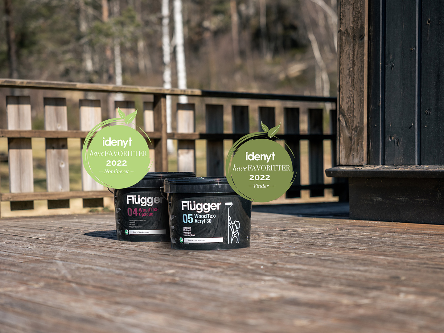 Flüggers Wood Tex 05 træbeskyttelse blev i 2022 kåret som vinder af IdéNyts havefavoritter blandt læserne. Den halvmatte dækkende træbeskyttelse tørrer hurtigt og kan klare regnbyer efter bare 1 time, og er derfor en helt genial træbeskyttelse til det let omskiftelige danske sommmervejr.